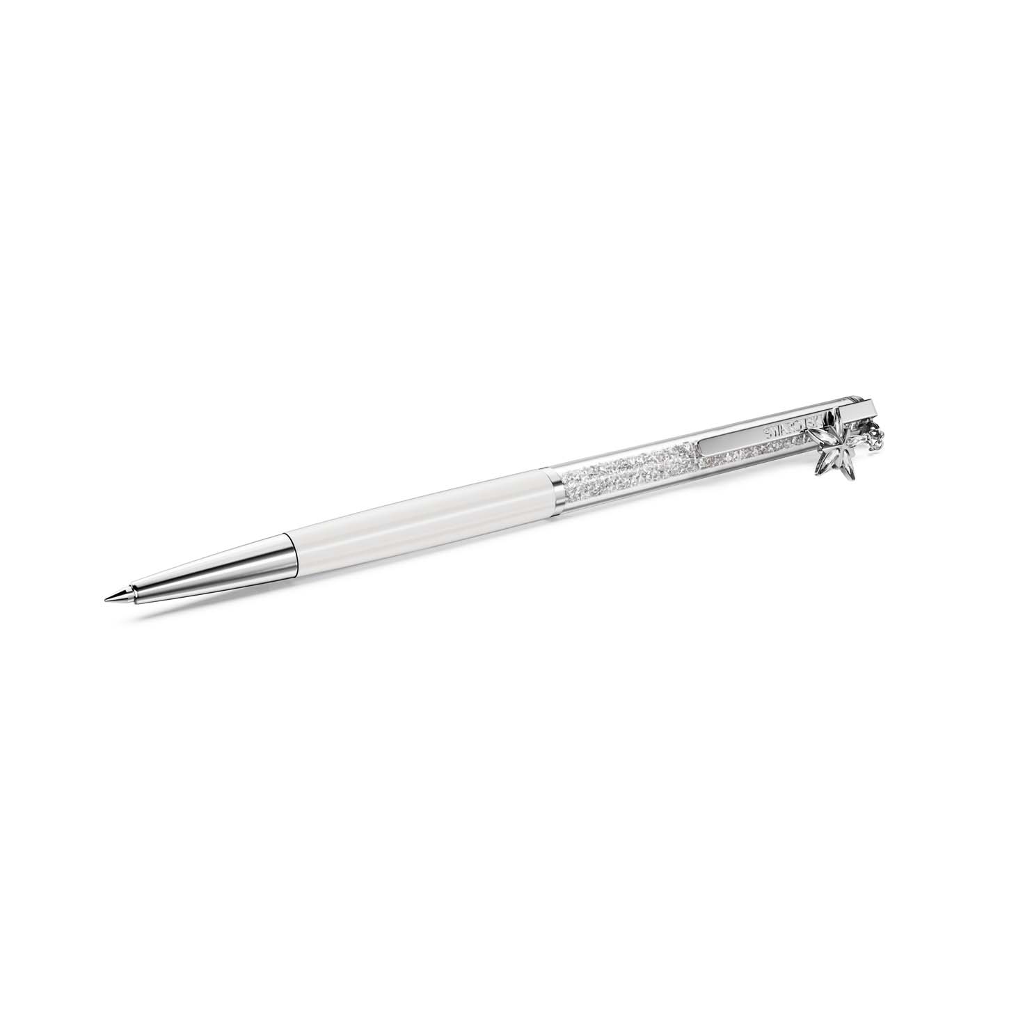 Questa penna a sfera Edizione Annuale 2026 si propone come un accessorio intramontabile per una creatività senza fine. Il design sottile è ricco di circa 400 cristalli Cry, visibili attraverso la lunga finestrella trasparente. Oltre al fusto laccato bianco, la penna presenta finiture cromate per un look ultra lussuoso. Un radioso charm a forma di stella è presente all’estremità della penna, con l’anno 2026 inciso sul retro. Le ricariche di inchiostro nero e blu sono disponibili per l’acquisto negli store Swarovski.