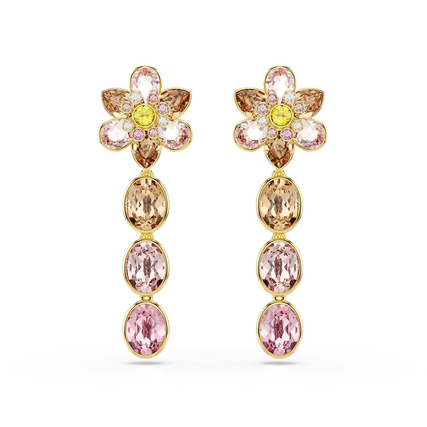 Pensati per essere un vero statement, questi orecchini placcati in tonalità oro sono una sinfonia di colore e luce. Ciascun orecchino rivela un fiore composto da cristalli di vari tagli e colori e presenta tre cristalli montati a castone che ricadono nelle stesse delicate tonalità. Questo paio ispirato alla natura è ideale per lo stile di tutti i giorni e si abbina splendidamente ad altri gioielli della famiglia Idyllia.