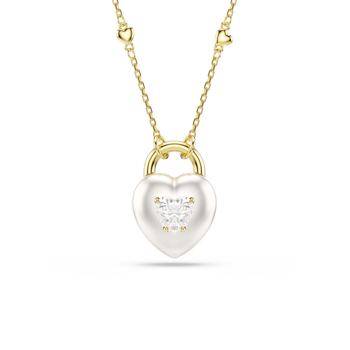 Simboleggiando i segreti dell’amore, il romantico pendente presenta un motivo a cuore ispirato a un medaglione, che può essere facilmente ruotato per mostrare due lati diversi. Su un lato, una superficie placcata rodio con un singolo cristallo a forma di cuore, e sull’altro, una radiosa incastonatura di Swarovski Zirconia in stile chatonnage. Il motivo è sospeso a una delicata catena in tonalità oro, anch’essa decorata con piccole bead a forma di cuore.