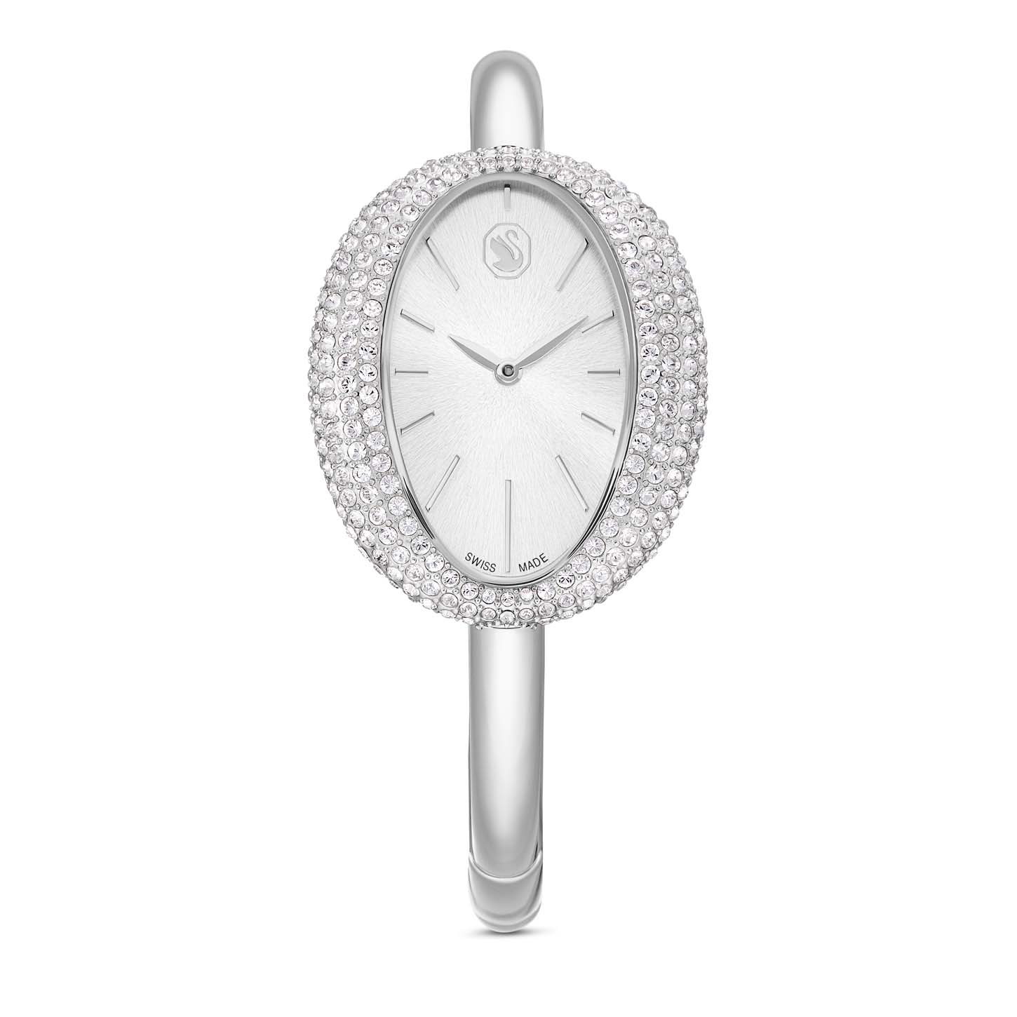 Giocando con le proporzioni, l’orologio Imber Bangle offre una silhouette straordinaria in acciaio inossidabile. La sua cassa di forma ovale presenta una lunetta impreziosita da circa 321 cristalli, che incornicia luminosa il quadrante con motivo sunray dell’orologio. Al polso, un bangle sottile e regolabile in acciaio inossidabile garantisce comfort e stile in ogni momento. L’orologio Swiss Made è resistente all’acqua fino a 50 metri e si abbina perfettamente ai gioielli Imber di Swarovski.