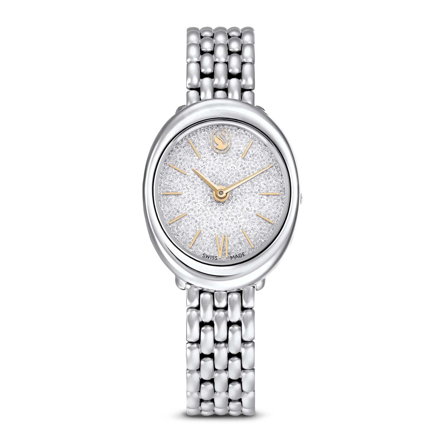 L’orologio Imber trasmette un approccio moderno all’orologeria grazie al suo quadrante scintillante e all’intramontabile forma ellittica. Questa versione da 24 x 26,3 mm è realizzata in acciaio inossidabile e presenta circa 1000 cristalli Cry sul quadrante Crystalline. Ulteriori dettagli sono rifiniti in tonalità oro, inclusi gli indici e le lancette delle ore, nonché l’unico numero romano a ore 6 e l’iconico logo cigno Swarovski a ore 12. L’orologio Swiss Made è corredato da un bracciale in metallo lucido e offre un’impermeabilità fino a 50 m. Rendilo la tua scelta ideale per uno stile sofisticato da giorno e da sera.