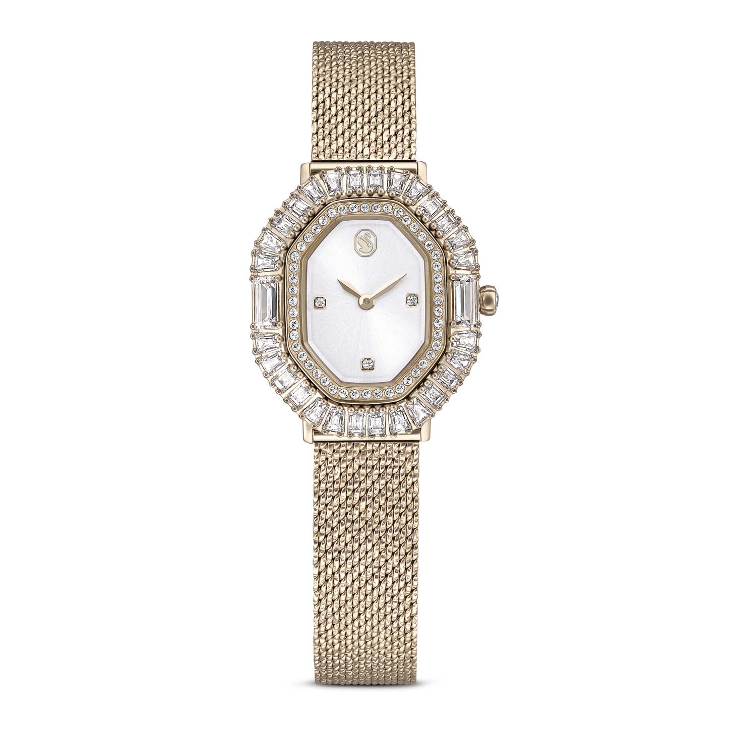 Questo innovativo orologio è una creazione unica nel suo genere che combina il design distintivo con la maestria della luce. Realizzato con autentico savoir-faire, l’orologio è ispirato alla famiglia di gioielli Matrix e presenta una cassa in acciaio inossidabile di 13 x 18 mm con finitura in tonalità oro champagne. La lunetta è presentata nell’iconica forma ottagonale di Swarovski e include un meraviglioso mix di 78 cristalli Cry e Swarovski Zirconia taglio Round e Fancy incastonati. Si crea così una radiosa cornice per il quadrante minimalista con motivo sunray, che mostra elegantemente tre indici delle ore in cristallo e un logo cigno. Un singolo cristallo è inoltre posizionato all’interno della corona, mentre intorno al polso, il lusso è ulteriormente accentuato da un bracciale in mesh regolabile. Questo orologio è resistente all’acqua fino a 50 m e simboleggia il moderno lusso di Swarovski nella sua massima espressione.