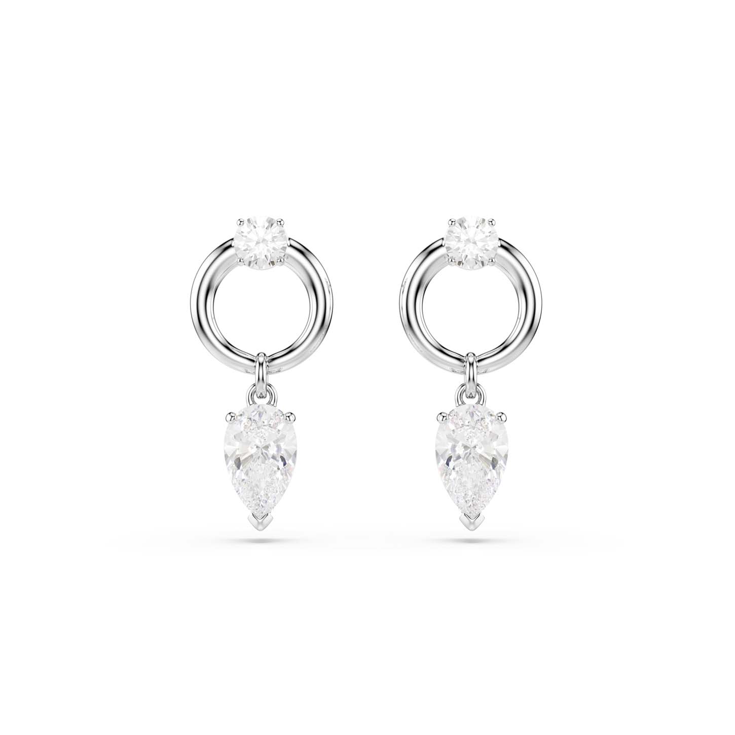 Cattura la luce da ogni angolazione con questi orecchini Mesmera unici. Ogni scintillante motivo presenta una Swarovski Zirconia taglio Pear, applicata a un lussuoso cerchio placcato rodio. Al centro è collocata anche una Swarovski Zirconia taglio Round. Indossali insieme al pendente coordinato per creare il tuo splendido set.