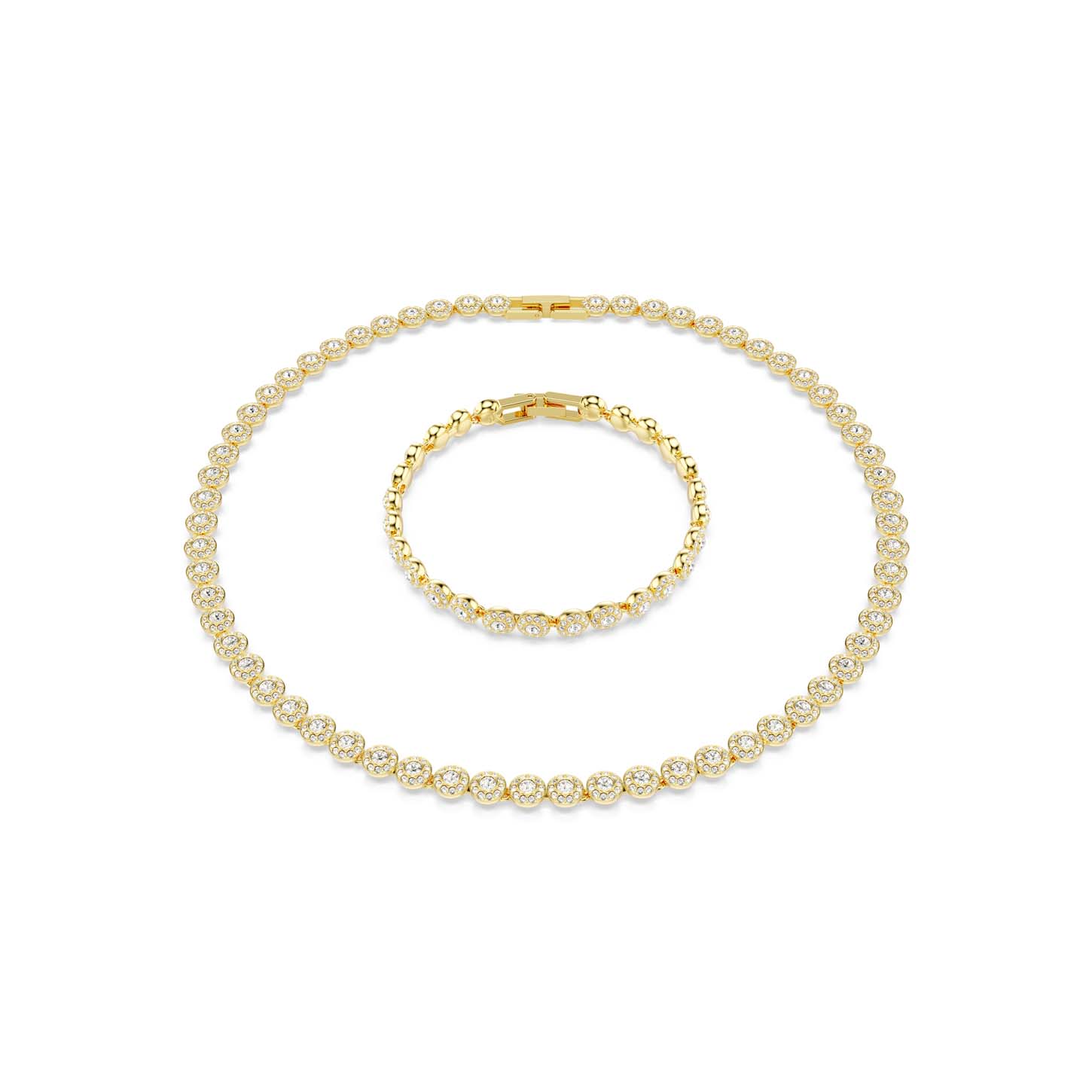 Perfetto per armonizzare il tuo stile all’insegna del lusso, questo set placcato in tonalità oro è nato per brillare. Ogni elemento è caratterizzato da una linea completa di cristalli taglio Round, ognuno dei quali è incorniciato da un alone di pavé di cristallo Cry. Questo include i raffinati motivi che impreziosiscono sia la collana che il bracciale. I fermagli di sicurezza garantiscono una chiusura invisibile, mentre gli extender aggiuntivi consentono di regolare i gioielli sia in termini di vestibilità che di lunghezza. Indossa questi splendidi accessori insieme per sfoggiare un look glamour da capo a piedi.